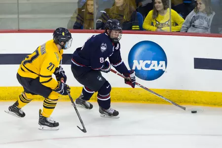 Notre Dame finished with a 39-32 edge on shots and finished with a power play goal on their only attempt. The Huskies were 1-for-2 on the power play and blocked 20 shots in the loss.
