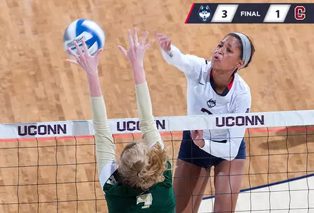 HAMILTON, N.Y. - Despite trailing early, the University of Connecticut volleyball team stormed back for a 3-1 win over Colgate on Saturday afternoon at the Cotterell Court. Senior outside hitter Jade Strawberry had a game-high 17 kills in the victory.