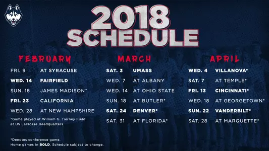 UConn's spring clip is relentless both in and out of conference play, as the Huskies play four games against 2017 NCAA tournament qualifiers. The Huskies will face two tournament teams in their first three contests, visiting Syracuse on Friday, Feb. 9, before taking on the Dukes in a neutral site tilt. UConn will entertain NCAA second round participant Massachusetts on Saturday March 3, while UConn travels to the sunshine state to take on BIG EAST foe Florida on Saturday, March 31.