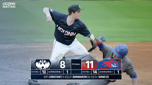 PORT ST. LUCIE - The UConn baseball team (3-1) banged out 13 hits and eight runs on Sunday but the offense was not enough as the Huskies dropped the final game of the series to UMass Lowell, 11-8.